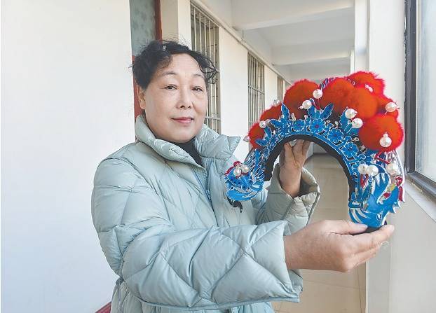 上图 冯瑞玲展示自己制作的头饰。